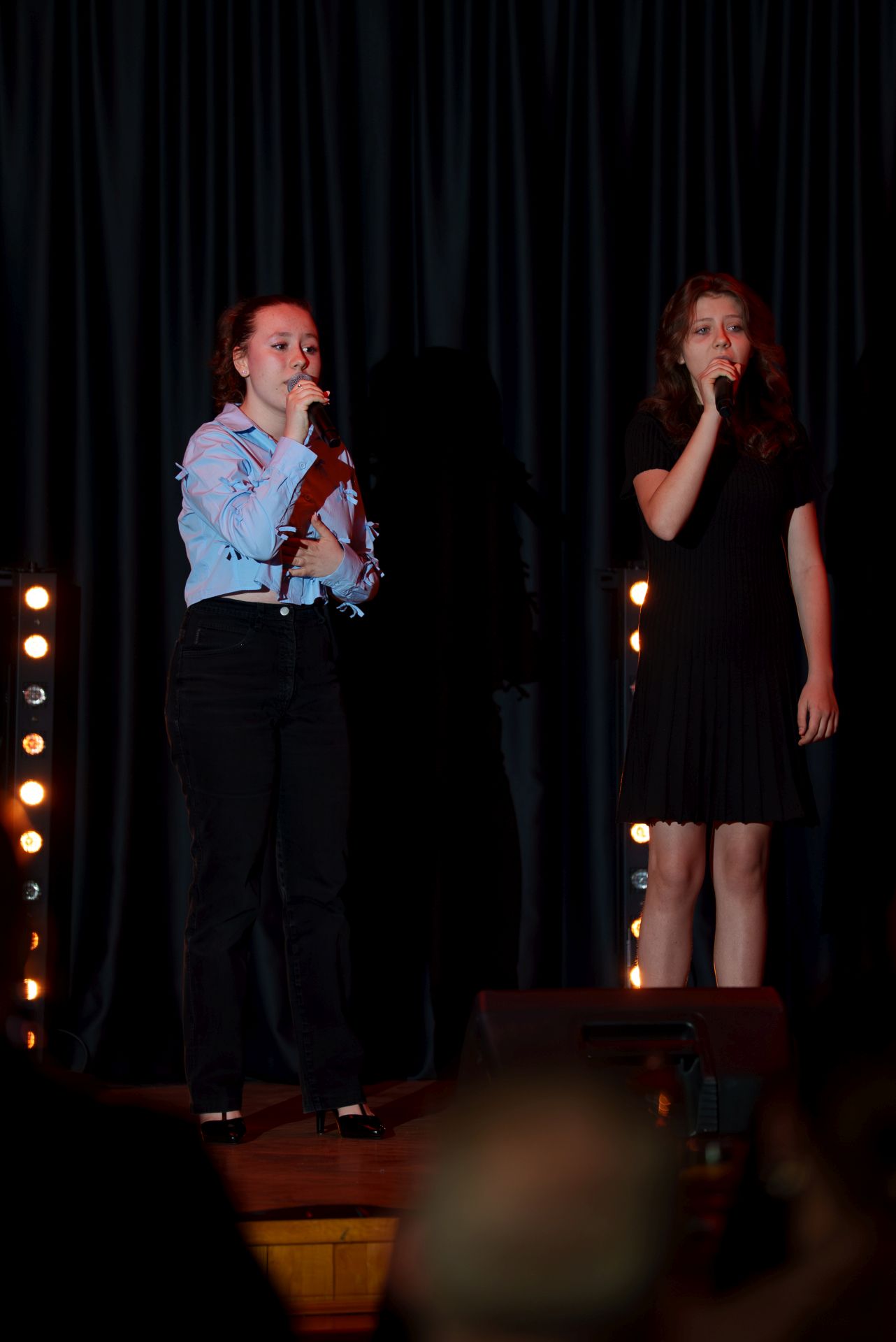 Dziewczyna śpiewająca na scenie. Dwie dziewczyny śpiewają na scenie.