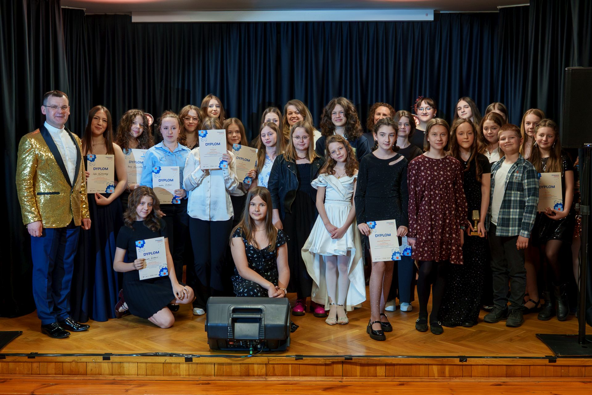 Mężczyzna w złotej marynarce wręcza nagrodę (statuetka) uczestniczce konkursu. Kobieta obok wręcza dyplom. Duża grupa młodych osób prezentująca dyplomy podczas zdjęcia grupowego.